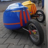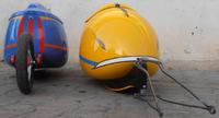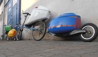 Bajerancka podpowiem w przyczepce umieśćcie akumulatory a w kole silnik robiłem próby z takim cudem. Zrobi furrorę i zaczep do każdego rowerka podłączasz tylko wtyczkę i jedziesz.  poniżej prototyp zbudowany na dwóch popychaczach z samochodu praktycznie nie czuć że coś się ciągnie kiedyś może wrócę do tego projektu bo dla kółka przydała by się amortyzacja   A jeszcze idealnie by było jak by sterownik i wszystko było w przyczepce bez kabli bez podłączania a sterowanie za pomocą serwa modelarskiego czy jak się to nazywa przypinasz tylko przyczepkę j w drogę masz rower elektryczny