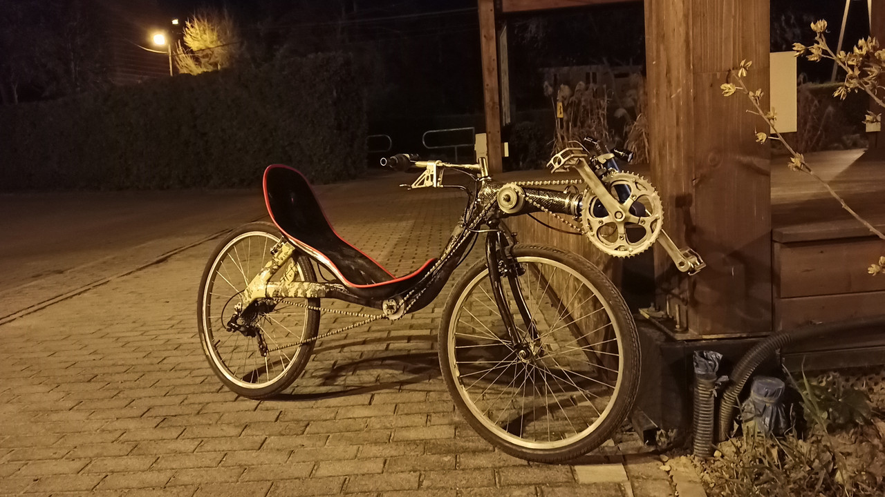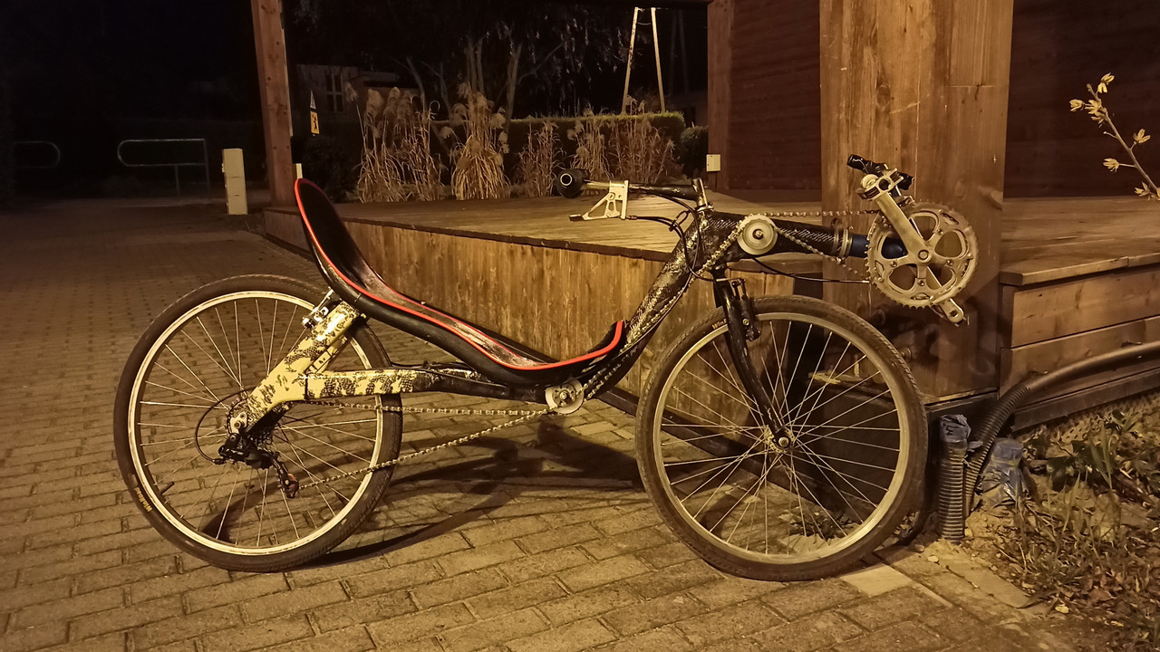 Zrobiło się całkiem ciekawie. Najpierw próbowałem wprowadzić zmiany które proponował Maciej, ale nie mogłem podciąć widelca, bo łańcuch trafiał centralnie w środek jego ramienia. Rolki z łyżworolek? Te z twardego tworzywa kosztują majątek, a gumiastych chyba lepiej nie montować. Finalnie udało się mi tylko wrzucić większe rolki, niestety są na jednym łożysku.