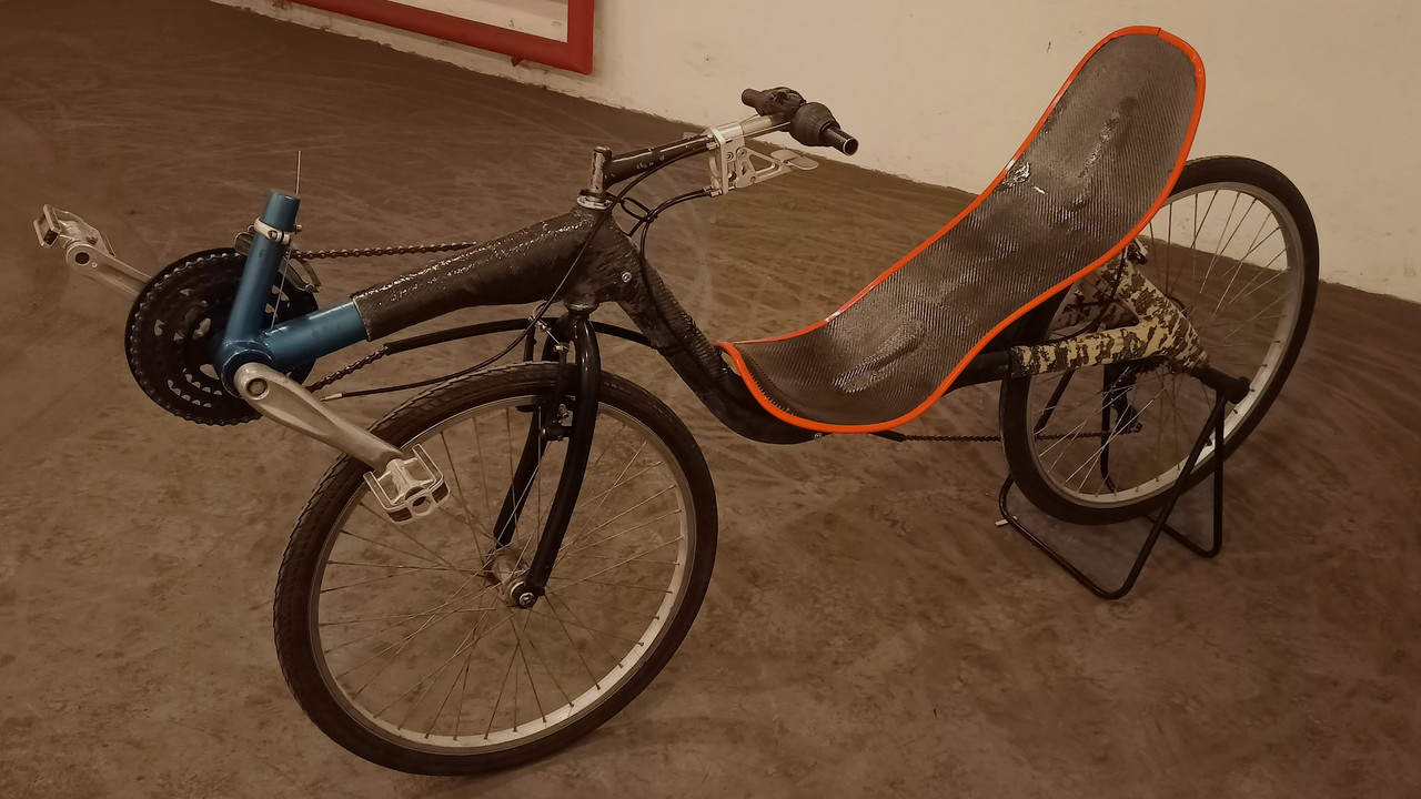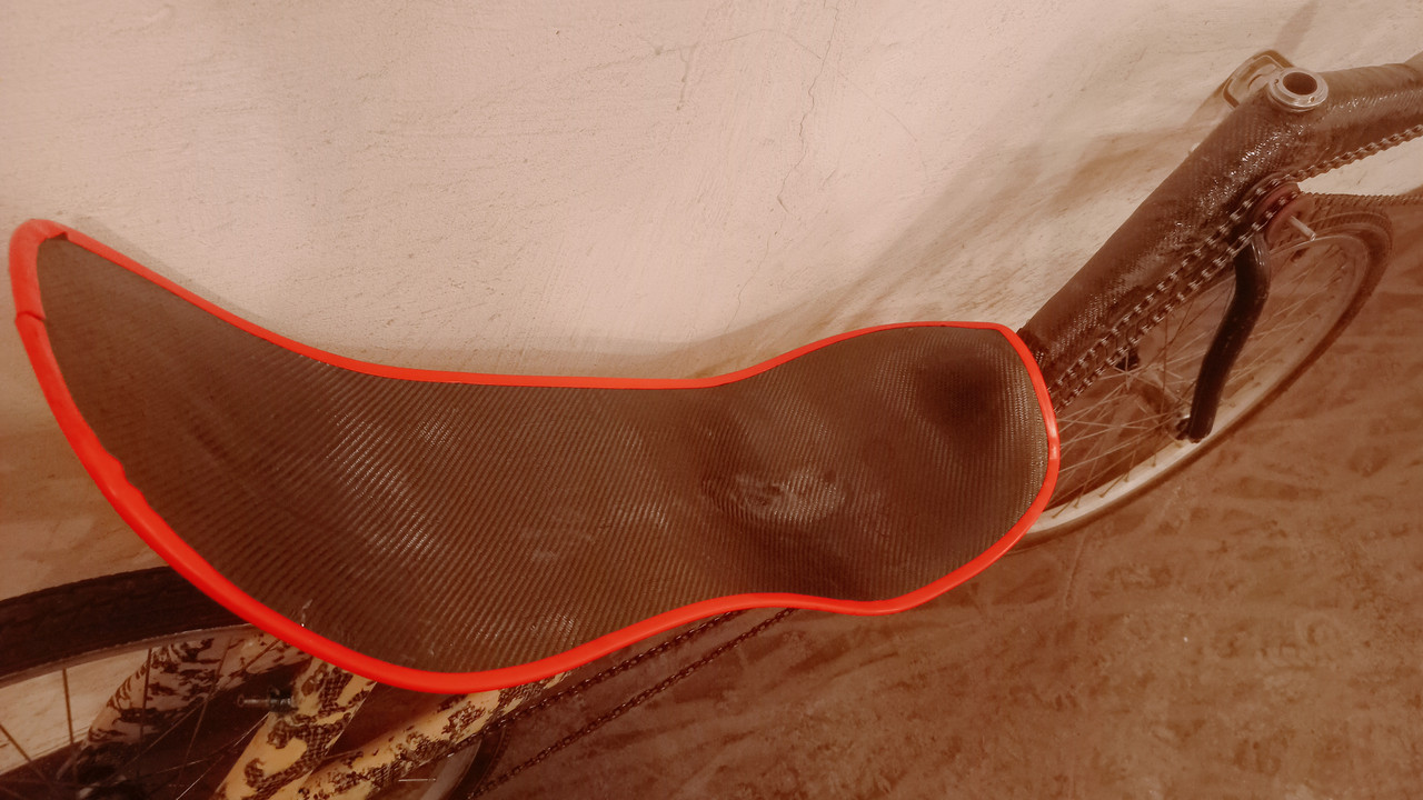 Skoro koło się wyprostowało, przyszedł czas na wzmocnienie fotelika; zarzuciłem tkaninę węglową i zapaćkałem żywicą.