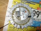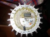 Kogut złożony na dwustronnym laminacie, w którym znalazło się miejsce dla 20 diodek LED koloru żółtego, dodatkowo sterowane są poprzez licznik NE555 oraz 4017. Do zapalenia każdej z par diodek posłużyły tranzystory bc848 (10 sztuk) oraz kilkanaście rezystorków smd. Do kompletu potrzeba było dokładnie dwóch kondensatorów oraz jeden potencjometr regulacyjny.