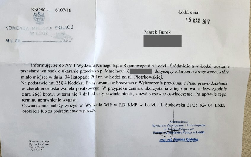 Żeby było ciekawiej, rower jest elektryczny. Myślałem, że będą jakieś komentarze ze strony policji, ale nic. Zrobili zdjęcia uszkodzeń, będzie ewentualna naprawa na koszt sprawczyni wypadku. Sprawa czysta, zresztą był monitoring w pobliskim supermarkecie i całe zdarzenie się nagrało. Miałem światła, jechałem przepisowo, miałem pierwszeństwo, a facetka może odtąd będzie bardziej uważać na rowery, bo nieźle ją skaleczyli finansowo, a i z z jej OC może uda mi się skubnąć to i owo. Warto rowerek dopieścić, bo ma już swoje latka...
