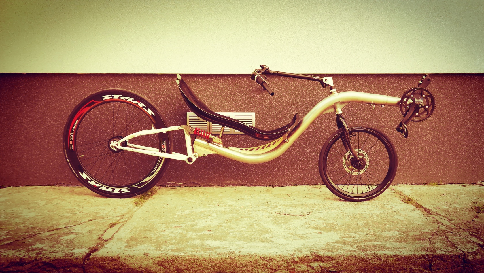 Tak sobie pomyślałem czy w tego typu rowerze sprawdziłby się z tyłu resor piórowy. jakby pióro resora dodatkowo zatopić w jakimś rodzaju gumy która wytłumiłaby drgania resora - spełniałaby to samo zadanie co tłoczek w resorze sprężynowym.
