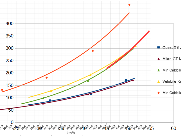 Uzyskanie krzywej, która byłaby wiarygodna na podstawie jednego punktu jest niemożliwe ale ponieważ znamy rodzaj zjawiska czyli liniowy rozkład oporów toczenia i kwadrat prędkości oporów aerodynamicznych oraz ponieważ jest bardzo wiele krzywych w internecie dla wielu różnych pojazdów w tym dla velo stąd z pewną ostrożnością mogłem określić moc dla tej konfiguracji w zakresie od ok 40+ do ok 60km/h. Nieźle ale jak zawsze chciało by się lepiej.