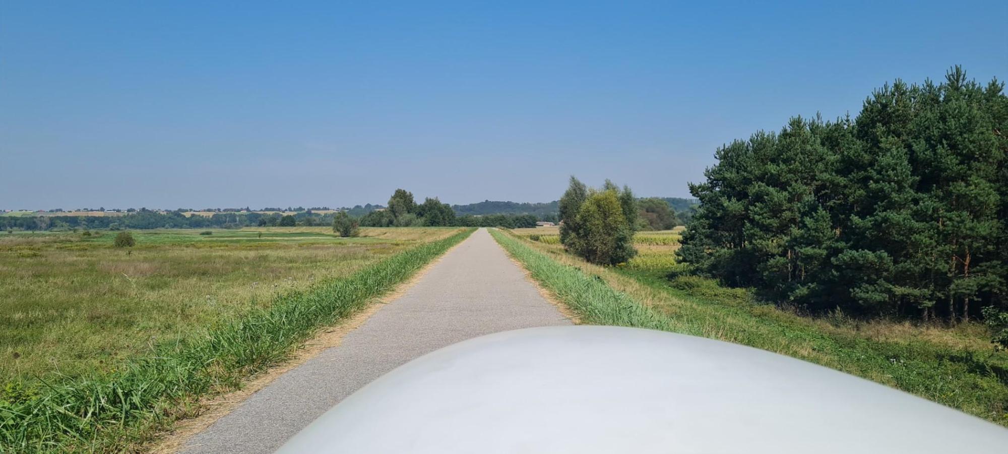 Kiedy od Józefowa wyjechałem znad Wisły pojawiły się pagórki, które trzymały aż pod Kazimierz Dolny i dopiero później zaliczyłem na pofalowanym, połatanym asfalcie, szalony zjazd gdzie blokowały mnie dwa auta i dobrze, bo okazało się, że na tych teoretycznie równinach zjazd może być tak stromy, że raz po raz traciłem przyczepność tyłu i ogarnąłem sytuację dochodząc do pulsacyjnego hamowania. Potem nastąpił piękny, długi odcinek, płaski, wzdłuż brzegi Wisły gdzie warunki pozwoliły na szybki przeskok. Dęblin.