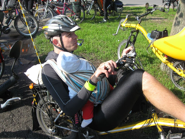 Na zlocie była też moja córka Ania, która jest o jeden dzień starsza od dziewczynek Lucyny i Igora, tylko my jeszcze nie mamy hamaka do przyczepki dla niej (przed zlotem dowiedziałem się od Igora, że takie w ogóle istnieją), więc przez część wycieczki podróżowaliśmy w taki sposób, dzięki czemu moja żona Kasia mogła trochę więcej pojeździć na rowerze. Chciałbym podziękować Bartkowi Nasierowskiemu (a nie jak poprzednio napisałem Zaborowskiemu) za pomysł wożenia Ani na brzuchu, Jankowi za rower, a Toudiemu za pomoc w doprowadzeniu go przed wycieczką pod Dom Studenta, Drzimiemu i innym osobom, których z imienia nie pamiętam za dodatkowe kartki na posiłki, Stormowi za zakup i dostarczenie Pepsi, znajomemu Janka za przewiezienie samochodem Kasi i Ani od remizy OSP do końca trasy (33,99km jazdy na rowerze Ani wystarczyły na pierwszy raz). Toudiemu i Bartkowi Nasierowskiemu (a nie jak poprzednio napisałem Zaborowskiemu) należą się również podziękowania, za to, że zostali z nami w lesie, gdy musieliśmy zrobić przerwę na karmienie Ani, a wszystkim pozostałym, którzy z nami jechali za wyrozumiałość w związku z nieplanowanym postojem.