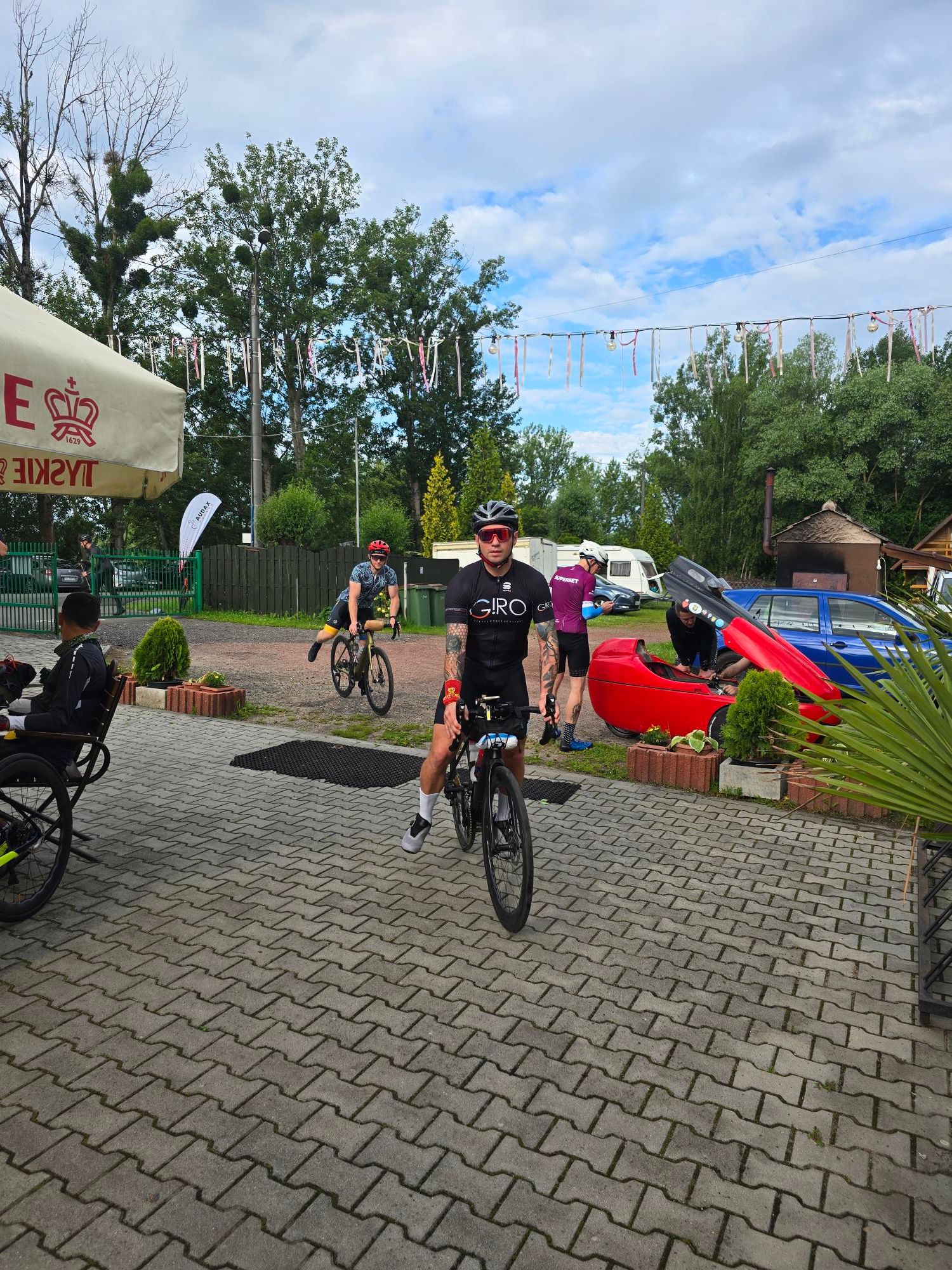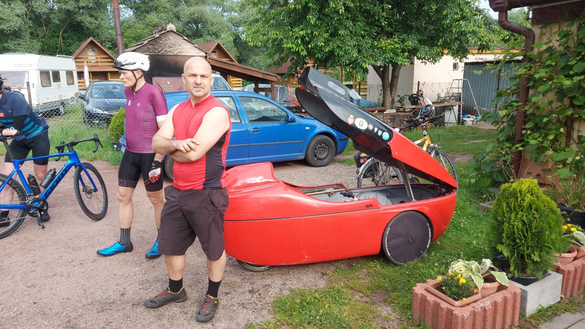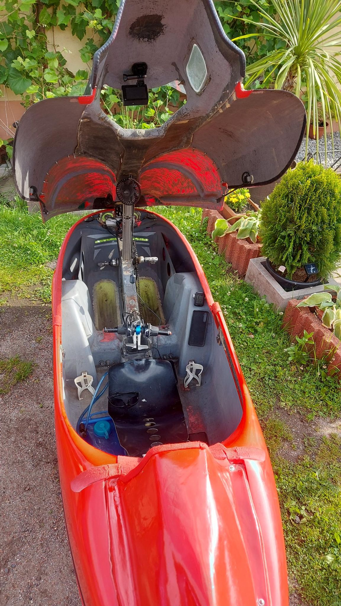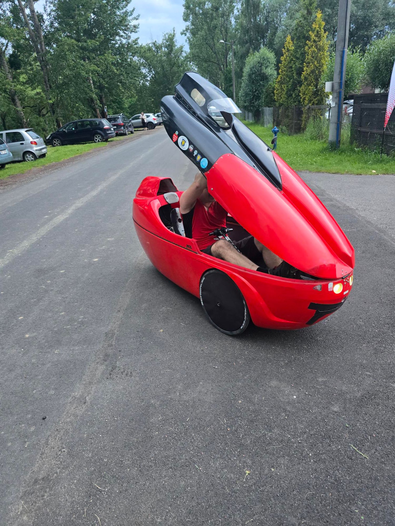 Start był oddalony o 20km ode mnie . Więc trzeba było się zaturlać. Na miejscu oczywiście tysiące pytań itp. Startowałem w 3 grupie (starty co 2 minuty), ale początek był w miarę płaski więc dopchałem się do czołówki. Potem zaczęły się górki i systematycznie spadałem, po ostatnim (4) punkcie kontrolnym byłem na końcu stawki. Ale jako że końcówka była już z górki, to finalnie przyjechałem piąty od końca. Czas 12,5h brutto. Co do samej jazdy -pod górę, wiadomo młynkowanie, ale lekko otwierałem przednią klapę - przewiew był całkiem przyzwoity. Zjazdy - cab rozpędza się błyskawicznie, musiałbym non stop hamować i spaliłbym hamulce. Z pomocą przyszedł mi spadochron, który na spadkach ok 6stopniowych trzymał prędkość w okolicy 5 dych. Mniej więcej za połową dopadł mnie kryzys, ale udało się przetrwać i noga znów zaczęła podawać. Nogi ok, tylko trochę drętwiały mi stopy. Ogólnie to wyrąbany jak koń po westernie byłem.