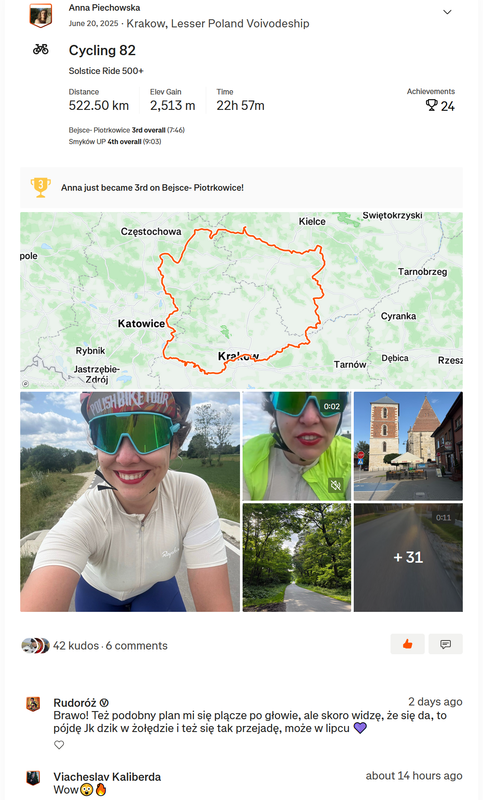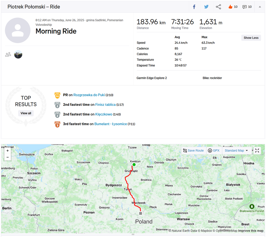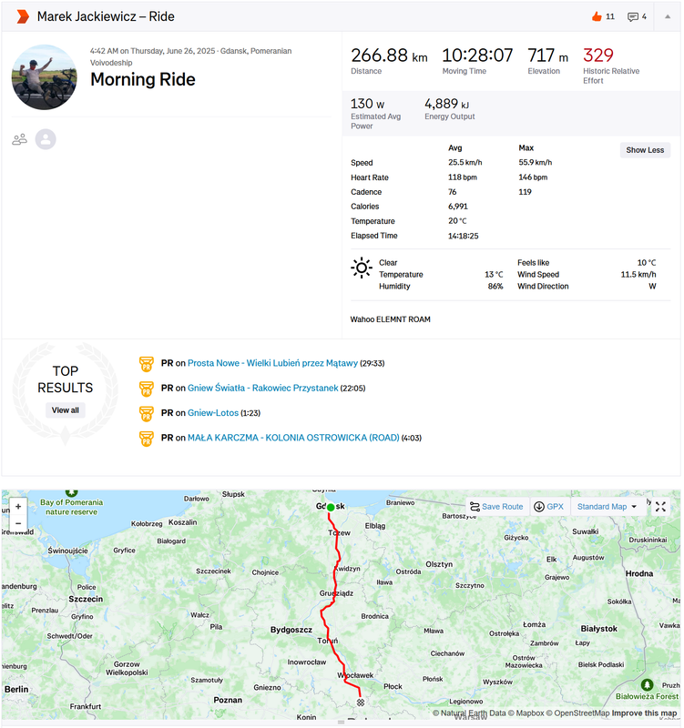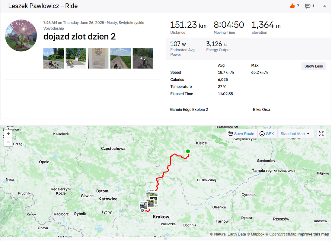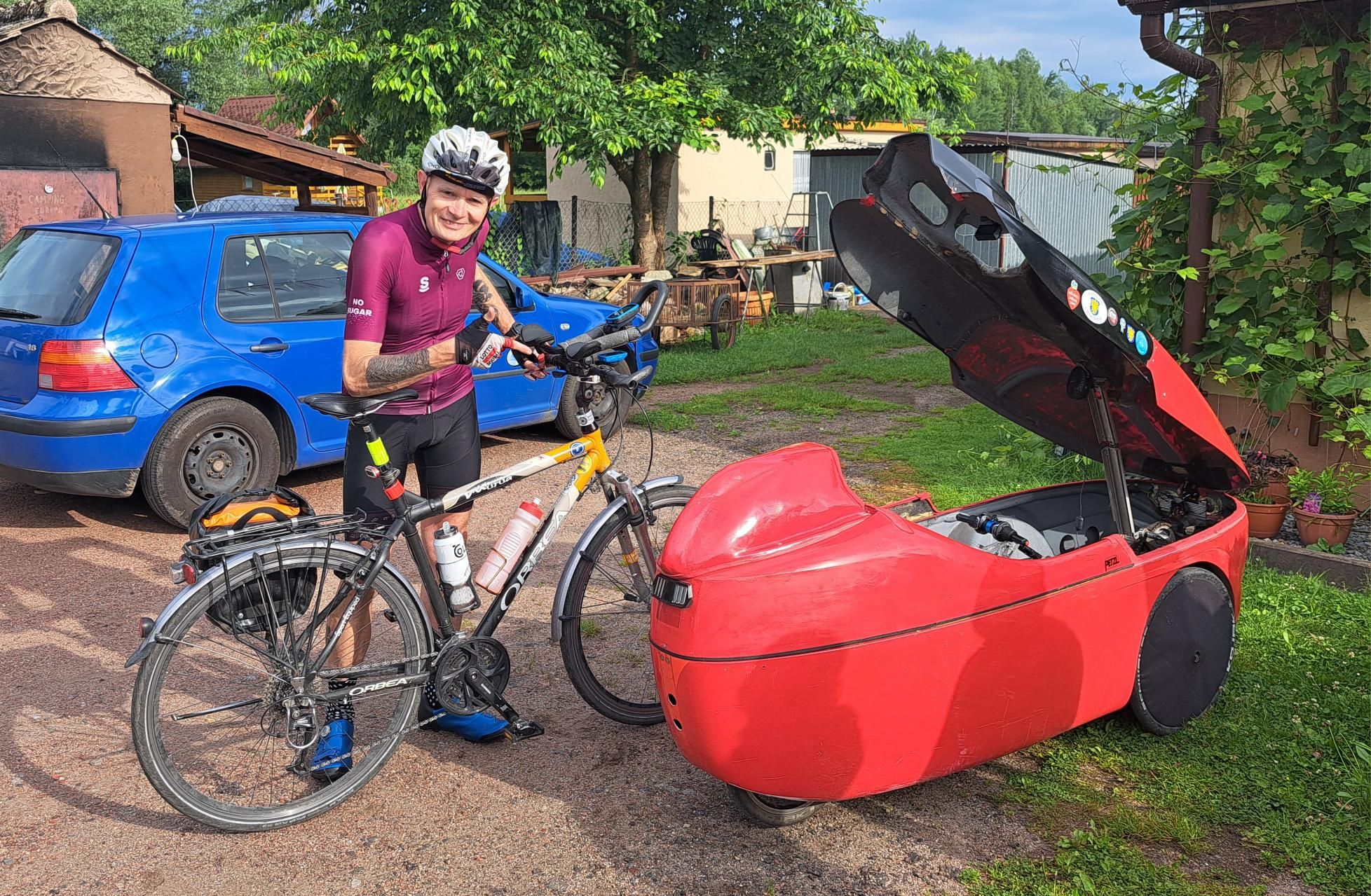 Start był oddalony o 20km ode mnie . Więc trzeba było się zaturlać. Na miejscu oczywiście tysiące pytań itp. Startowałem w 3 grupie (starty co 2 minuty), ale początek był w miarę płaski więc dopchałem się do czołówki. Potem zaczęły się górki i systematycznie spadałem, po ostatnim (4) punkcie kontrolnym byłem na końcu stawki. Ale jako że końcówka była już z górki, to finalnie przyjechałem piąty od końca. Czas 12,5h brutto. Co do samej jazdy -pod górę, wiadomo młynkowanie, ale lekko otwierałem przednią klapę - przewiew był całkiem przyzwoity. Zjazdy - cab rozpędza się błyskawicznie, musiałbym non stop hamować i spaliłbym hamulce. Z pomocą przyszedł mi spadochron, który na spadkach ok 6stopniowych trzymał prędkość w okolicy 5 dych. Mniej więcej za połową dopadł mnie kryzys, ale udało się przetrwać i noga znów zaczęła podawać. Nogi ok, tylko trochę drętwiały mi stopy. Ogólnie to wyrąbany jak koń po westernie byłem.
