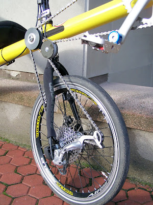 wiec taki napęd na przednie koło o wiele zwiększa zwrotność takiego roweru na ktorym nie można ostro skręcac bo przednie koło uderza w lańcuch.